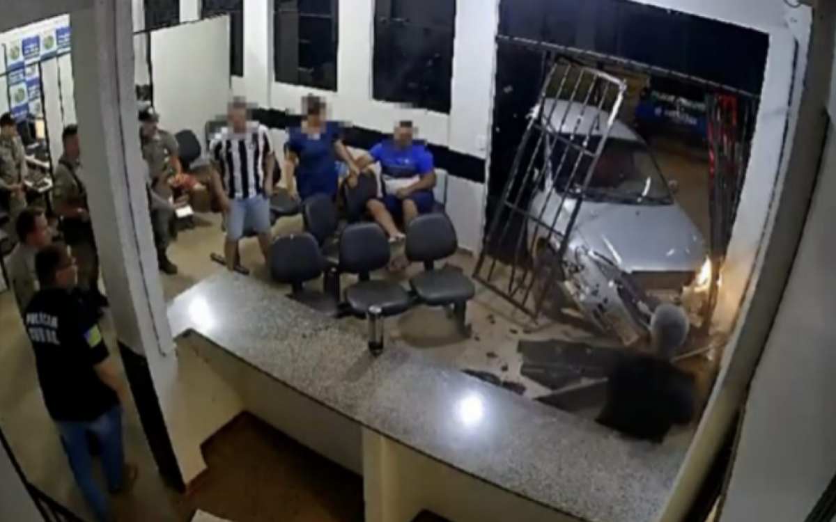 Nas imagens, gravadas por câmeras de segurança, o veículo aparece detonando a porta de vidro da unidade, que ficava na frente de uma grade. Após a invasão, o motorista saiu do carro e o carona fugiu pela janela.