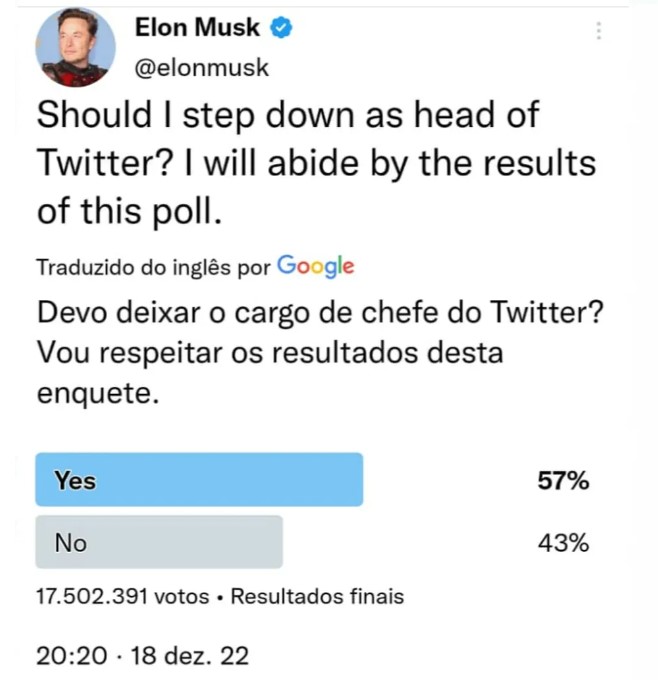 Musk, inclusive, disse ainda que iria acatar a opinião da maioria. Essa também não é a primeira vez que ele usa o recurso para uma decisão importante no Twitter.