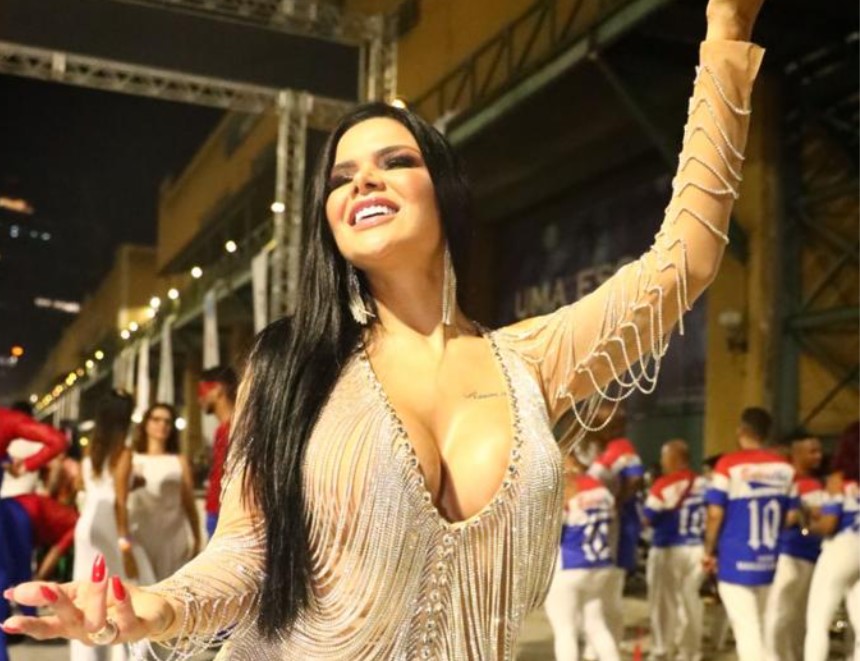 A Rainha de bateria da União da Ilha apostou em um look esplendoroso, um vestido de tule que trazia transparência com correntes de strasse com seis mil pedras de Swarovski e que deixou em evidência o corpo esguio da empresária: