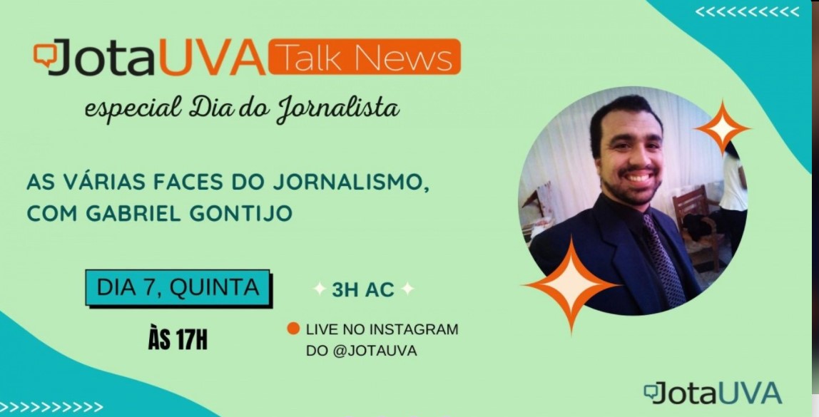 Em comemoração ao Dia do Jornalista, o JotaUVA Talk News volta em uma edição especial, com a presença do jornalista e radialista Gabriel Gontijo, nesta quinta-feira (7). A live “As várias faces do Jornalismo” será realizada pelo perfil do Jota UVA no Instagram, às 17h, explorando o trabalho do jornalista nos mais variados campos de trabalho.