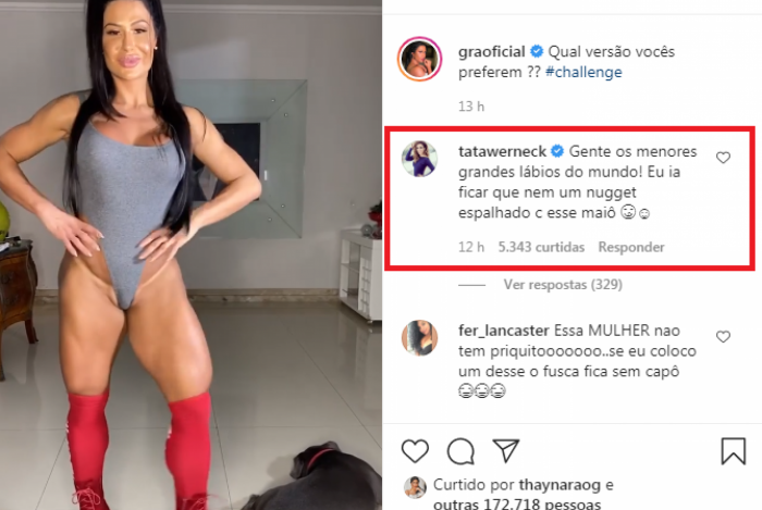 O deslize, é claro, não passou despercebido e rendeu diversos comentários nas redes sociais, inclusive da humorista Tatá Werneck. “Gente, os menores grandes lábios do mundo! Eu ia ficar que nem um nugget espalhado com esse maiô” “Inveja dessa piriquita sequinha”, comentou outra seguidora.