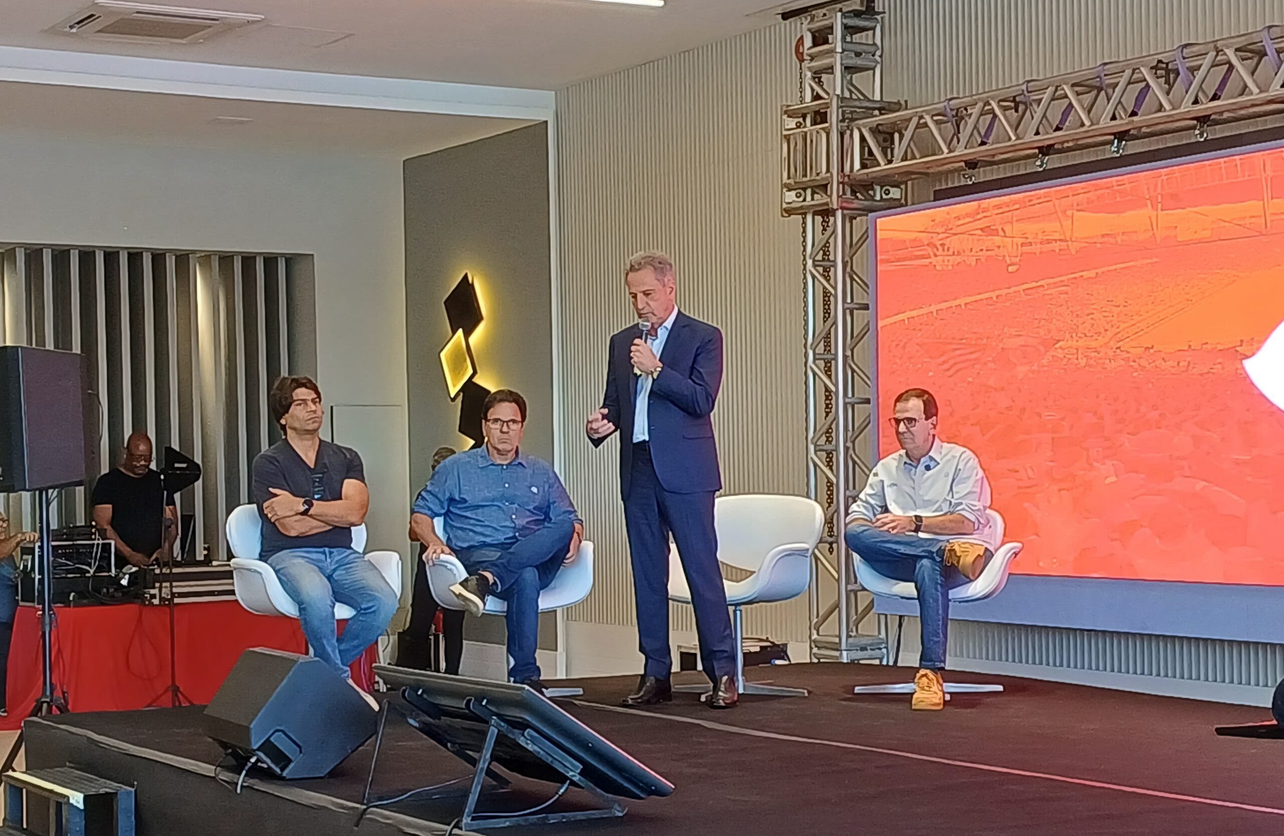 Eduardo Paes compareceu à sede da Gávea, na manhã desta segunda-feira (24), para assinar o potencial construtivo do novo estádio do Flamengo. O prefeito do Rio de Janeiro decretou o auxílio de R$ 1 bilhão para compor os gastos referentes à construção. O mandatário também acompanhou o vídeo e as imagens do projeto da arena no telão, discursando na sequência.