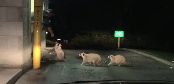 Um grupo de guaxinins, em fila, no guichê de atendimento drive-thru de uma lanchonete em Ontário, no Canadá viralizaram.