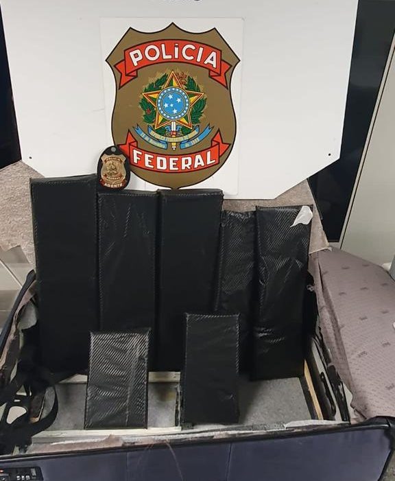 A droga estava no forro da mala. Ela tentava embarcar para Londres, na Inglaterra, quando foi surpreendida pelos policiais.