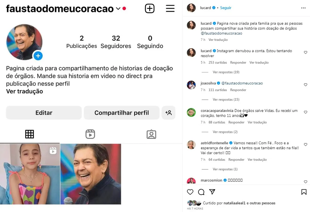 Luciana Cardoso, esposa do apresentador Fausto Silva, anunciou nesta quarta-feira (23) que criou uma conta no Instagram chamada “Faustão do meu coração” para compartilhar histórias de doações de órgãos. A iniciativa surgiu assim que o apresentador entrou para a fila do transplante de coração no último final de semana, porém, foi a atitude da família foi interrompida pela própria rede social, que com apenas dois posts no ar, desativou o perfil.