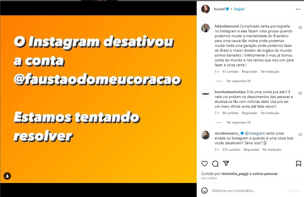Luciana prontamente avisou aos fãs que está tentando resolver o problema. Na legenda escreveu: “Complicado tanta pornografia no Instagram e eles fazem vista grossa quando podemos mudar a mentalidade do brasileiro para uma causa tão nobre, onde podemos mudar toda uma geração, onde podemos fazer do Brasil o maior doador de órgãos do mundo somos barrados! Infelizmente o mal já tomou conta do mundo e nós temos que nos unir para fazer a coisa certa!”