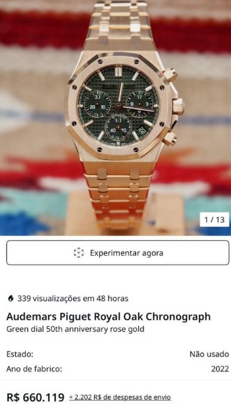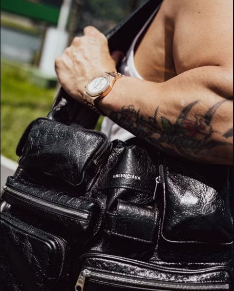 Trata-se de um modelo em ouro rosé Audemars Piguet Royal Oak Cronograph, comemorativo aos 50 anos da marca. Belo começou a se interessar por relógios de luxo recentemente. “Eu comecei agora a comprar alguns, além de gostar, jóia é um investimento”, explica.