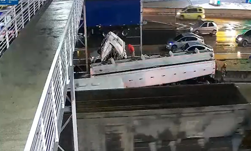 Um caminhão bateu em uma passarela da Av. Brasil, na altura do Caju, sentido Centro, no fim da noite desta quinta-feira (12). A cabine do veículo ficou no sentido contrário do baú após o choque com a estrutura da passarela.