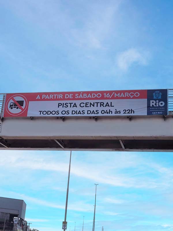 Com isso, a avenida está ganhando sinalização específica sobre essas restrições para caminhões. Faixas e galhardetes estão sendo instaladas para que os motoristas não tenham dúvida quanto aos dias e horários permitidos e proibidos, além dos trechos restritos. Mensagens nos painéis da CET-Rio também estarão informando sobre as alterações implantadas.