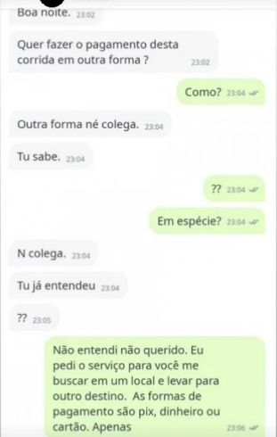 O motorista acusado de assédio sexual por uma passageira foi retirado permanentemente da plataforma inDrive. A DJ Talie informou, na última segunda-feira (22), que o homem, antes de chegar ao local de embarque, enviou mensagens sugerindo que a corrida fosse paga com relação sexual.