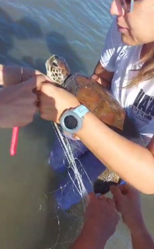 “Olhei para o mar e vi que tinham umas boias e os isopores da rede afundados, o que é uma característica de quando tem tartarugas presas nas redes. Pessoas que estavam em uma canoa nos ajudaram a tirar os animais da rede com uma faca”, contou.