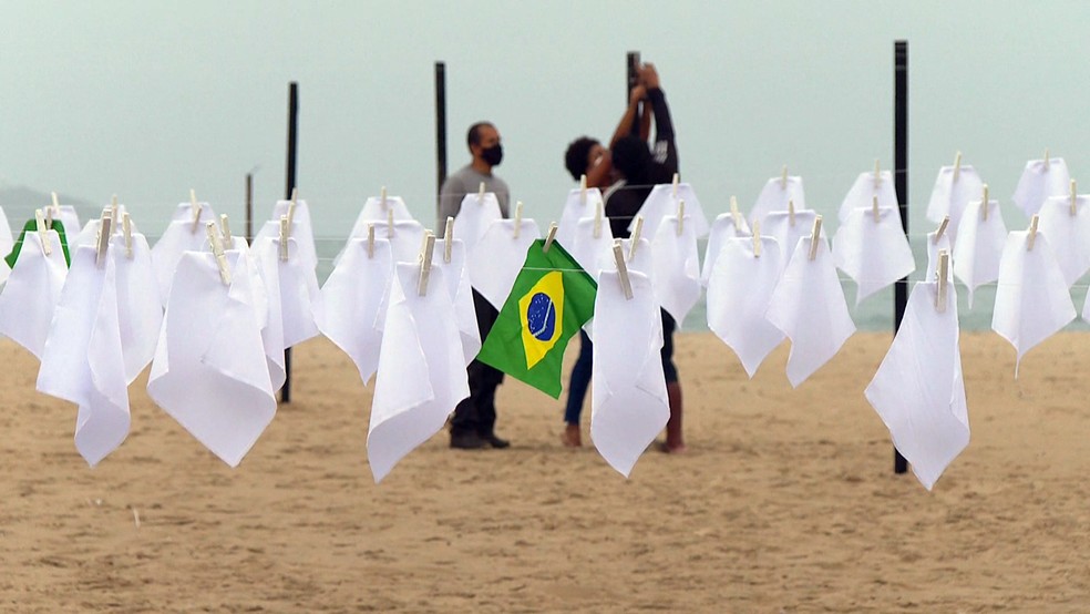 Nesta sexta-feira (8), A ONG Rio de Paz homenageou os quase 600 mil mortos pela Covid no Brasil. A ONG estendeu 600 lenços brancos em um varal na areia de Copacabana, em frente ao Hotel Copacabana Palace.