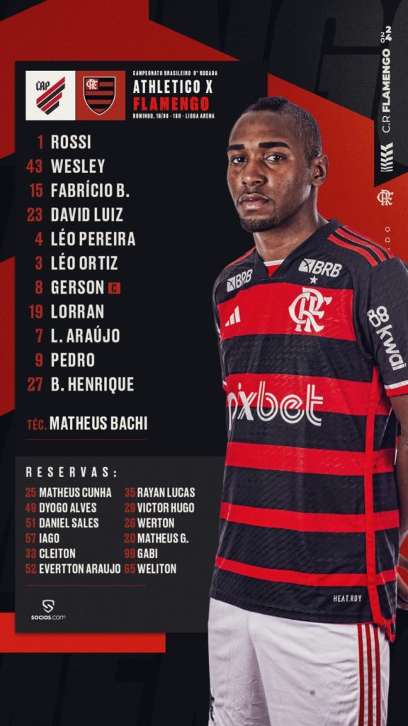 O Flamengo está bem desfalcado para a partida de logo mais às 16h, contra o Athletico-PR, na Ligga Arena. O Rubro-negro tem onze jogadores fora, entre lesão ou convocação, além do técnico Tite, suspenso.