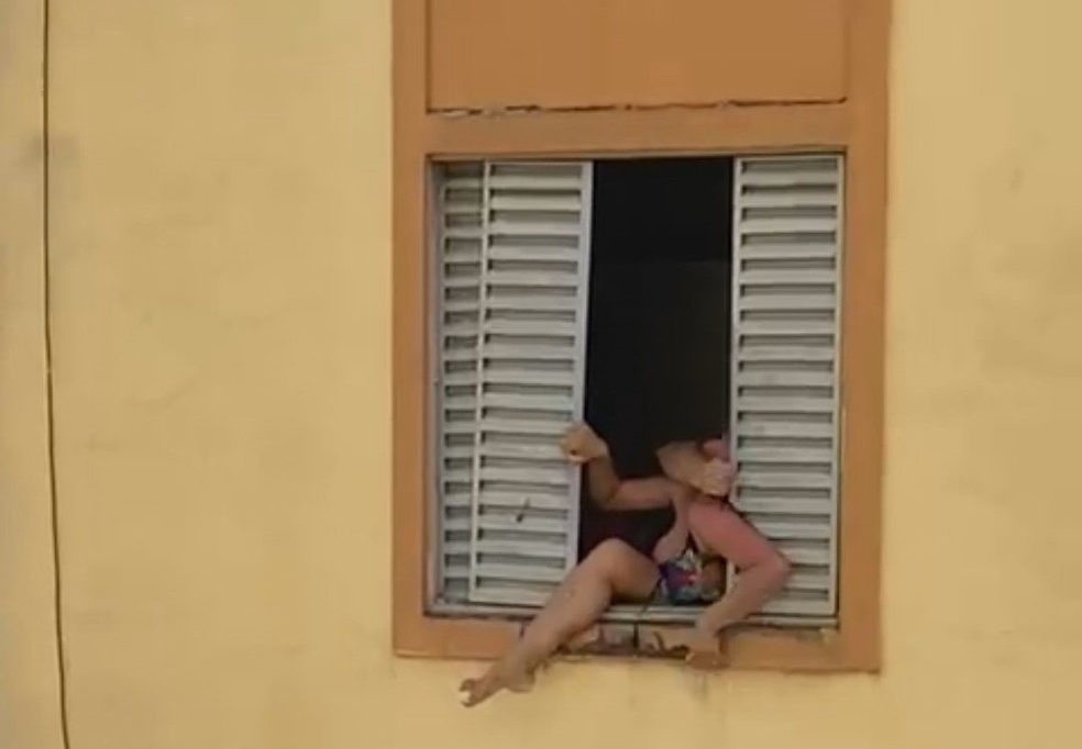 Maria José foi filmada tentando pular a janela do segundo andar durante a briga — Foto: Reprodução/rede social
