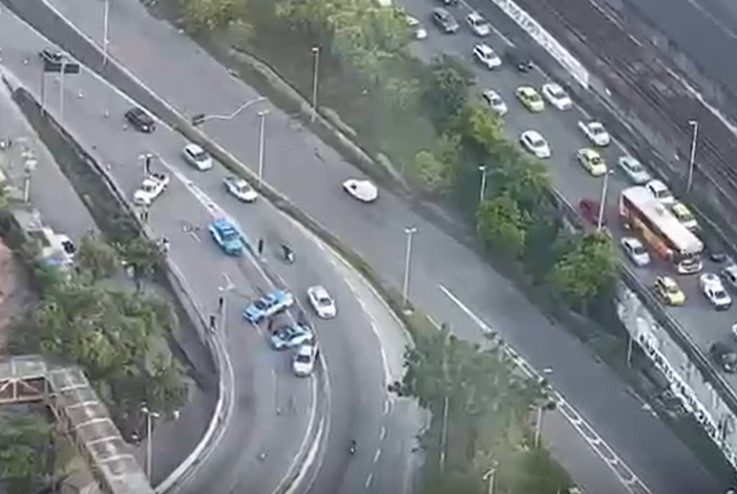 O trânsito está impactado no trecho por conta da presença de agentes e viaturas da concessionária Lamsa, responsável pela administração da Linha Amarela.