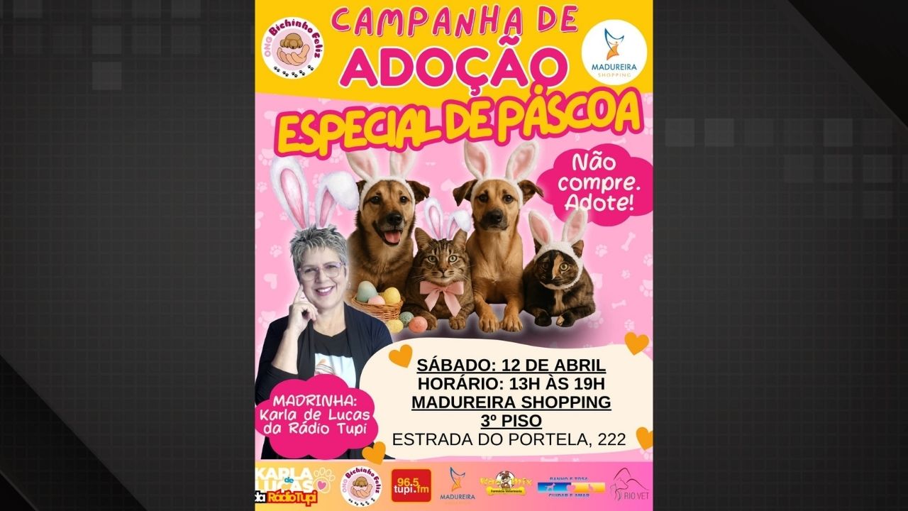 A ação acontece das 13h às 19h, no terceiro piso do centro comercial, na Estrada do Portela, 222A ONG Bichinho Feliz realiza neste sábado (12) mais uma edição de sua tradicional campanha de adoção de animais no Madureira Shopping, na Zona Norte do Rio. A ação acontece das 13h às 19h, no terceiro piso do centro comercial, na Estrada do Portela, 222.