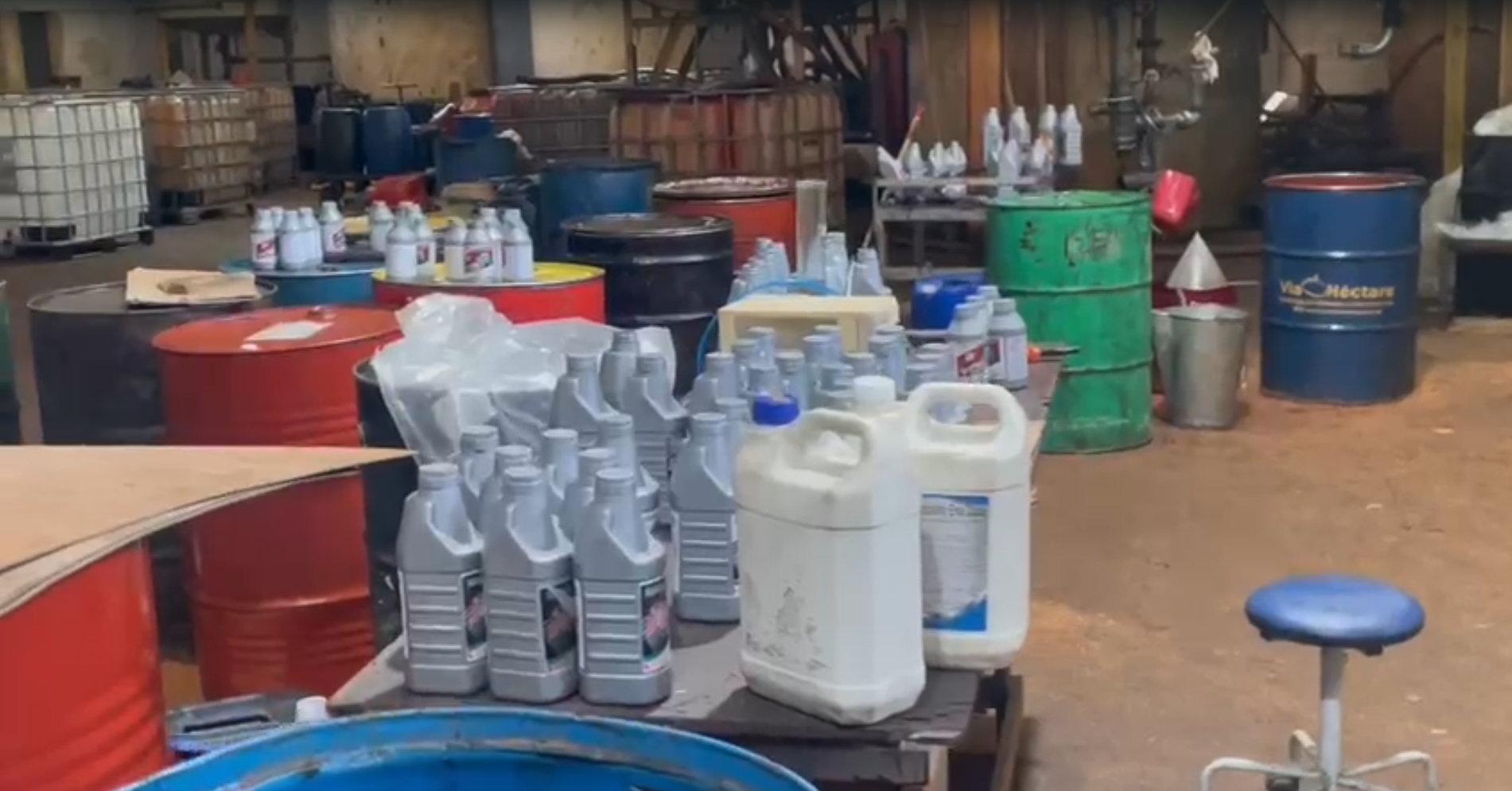 No galpão com cerca de cinquenta mil metros quadrados foram encontradas diversas caixas de óleo lubrificante já embaladas para a venda, diversos galões com material combustível armazenado e diversos equipamentos utilizados na produção clandestina do óleo lubrificante.