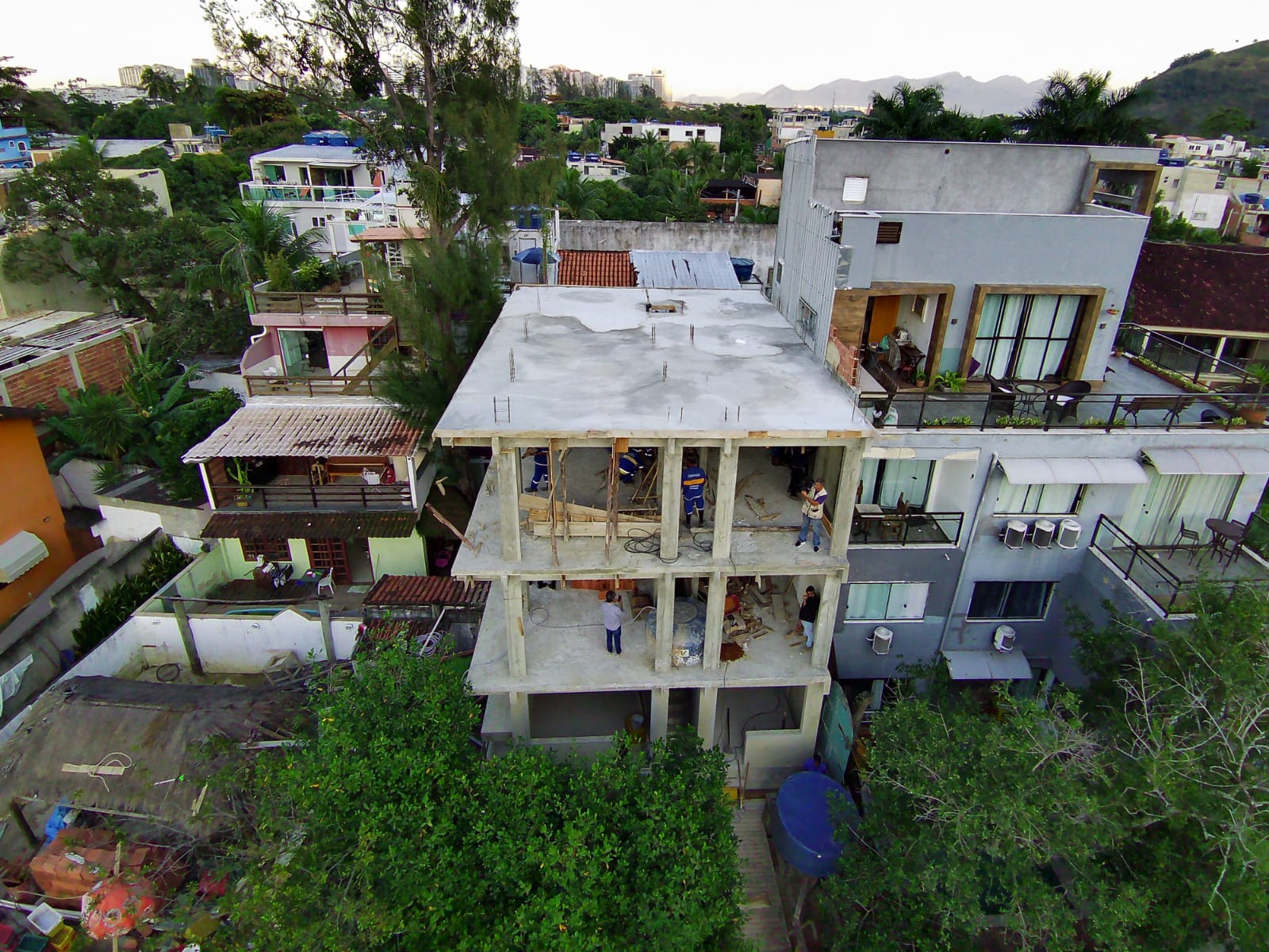 A construção do primeiro andar estava em fase de alvenaria, enquanto os demais pavimentos já estavam sendo estruturados. O imóvel também possuía um deck, ocupando uma área total de 250 m², sem qualquer autorização da Prefeitura.