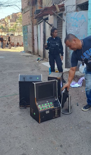 Além disso, quatro máquinas caça-níqueis, um computador, um caderno de anotações, cinco extintores e dois botijões foram retidos pela equipe. Aproximadamente 300 quilos de lixo e resíduos foram recolhidos pela Comlurb.