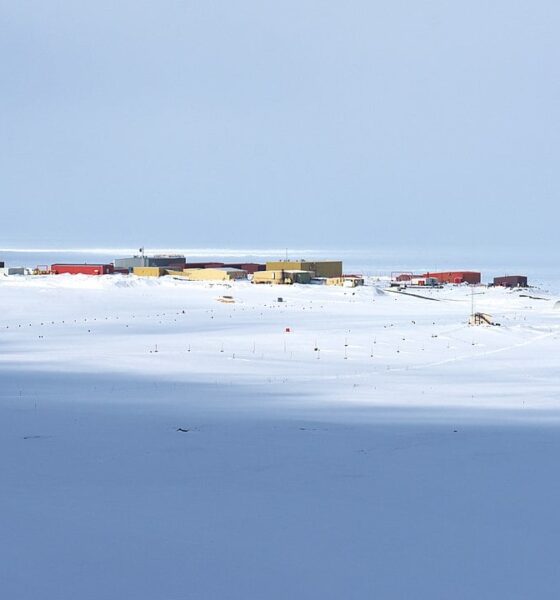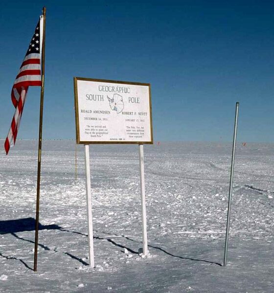 Crédito: wikimedia commonsPonto mais meridional (ao Sul) sem habitantes - Polo Sul Geográfico - O primeiro a chegar foi o grupo de Roald Amundsen (14/12/1911). Um mês depois, o grupo de Robert Falcon Scott alcançou o polo, mas, na volta, eles morreram de fome e frio. A Estação Polo Sul Amundsen-Scott é ocupada por pesquisadores desde 1957.