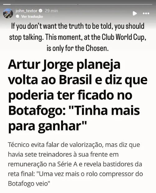 “Se você não quer que a verdade seja dita, deveria parar de falar. Esse momento, no Super Mundial de Clubes, é só para os Escolhidos“, escreveu Textor ao compartilhar um print da matéria.