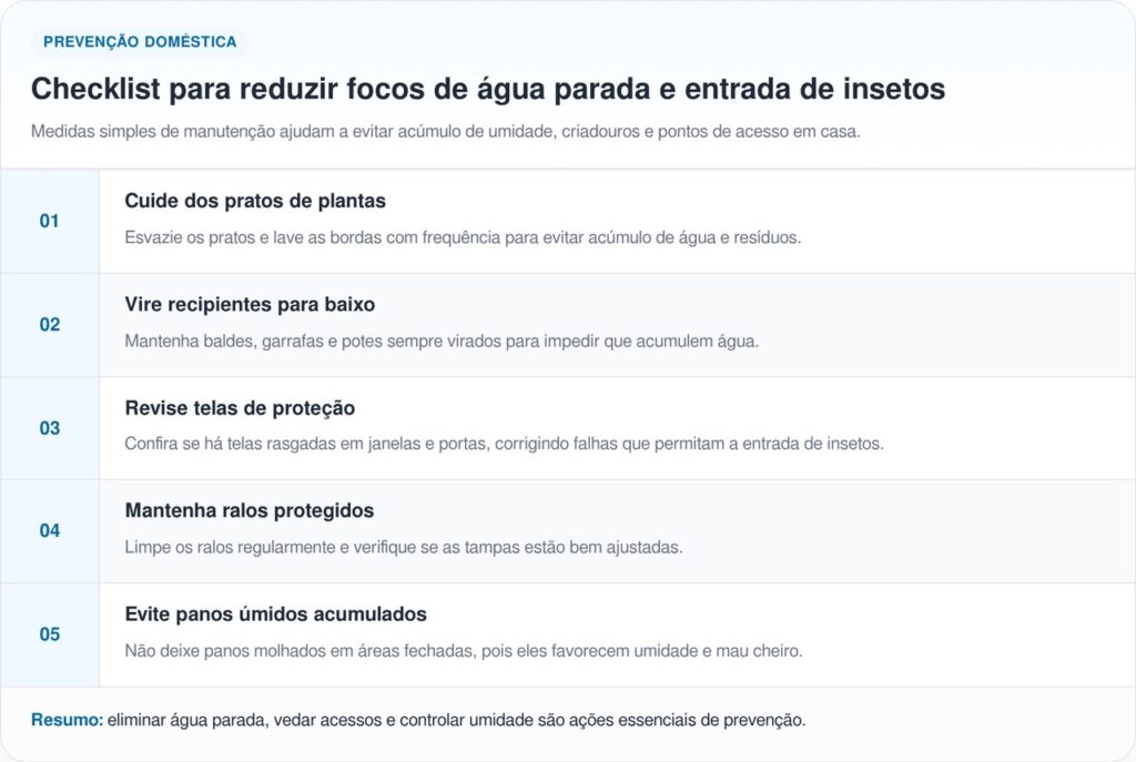Em casas com bebês, idosos, pessoas alérgicas ou muitos insetos, o cuidado precisa ser maior. A dica pode reduzir o incômodo em um ponto específico, mas o controle real depende de barreiras físicas, rotina de limpeza e eliminação dos locais onde o mosquito nasce.