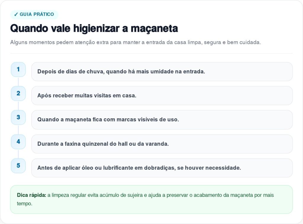 O resultado depende menos da quantidade de produto e mais do método: pano macio, pouca umidade, retirada do excesso e secagem completa. Com esses cuidados, a entrada da casa fica limpa, a maçaneta recebe atenção adequada e o primeiro ponto de contato do lar transmite uma sensação real de ordem, higiene e acolhimento.