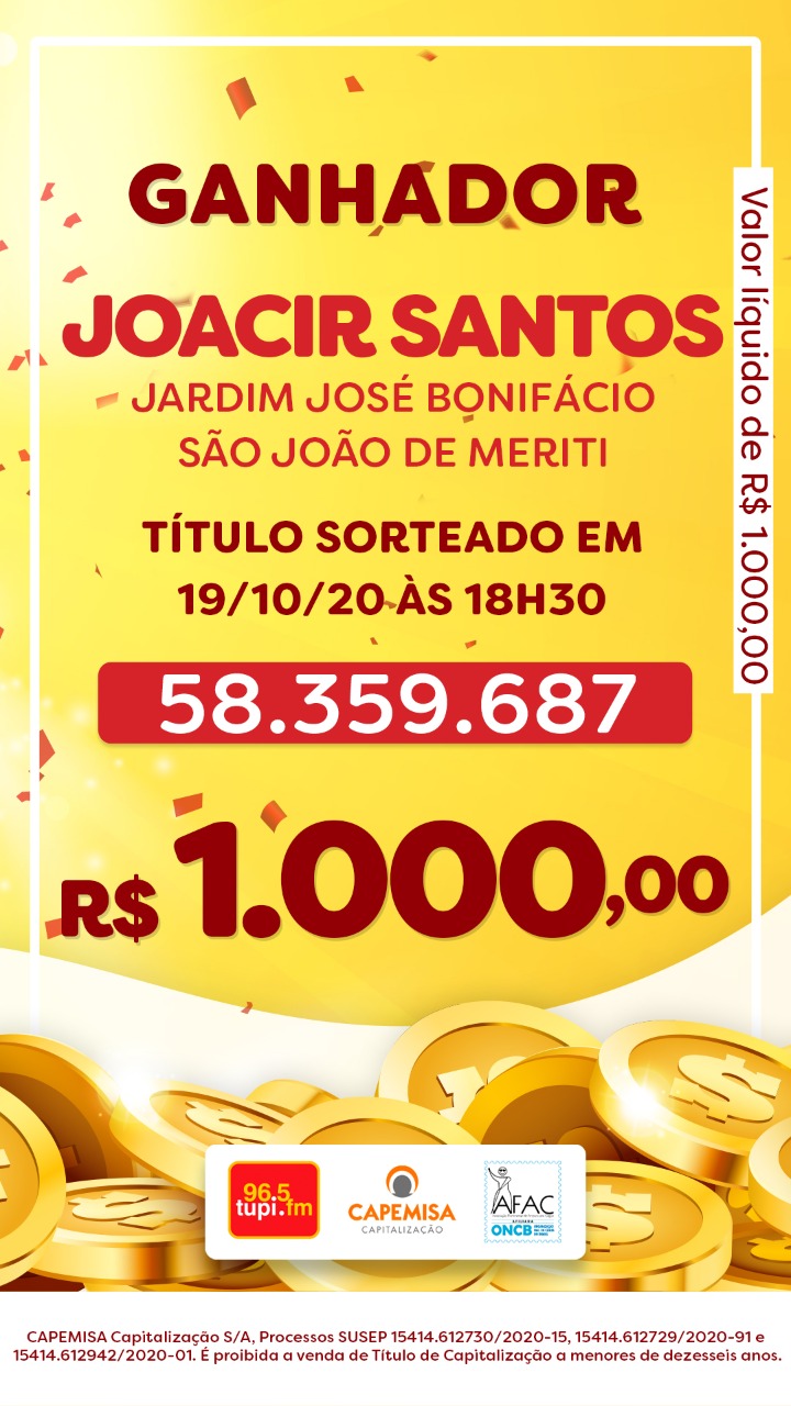 O segundo sorteio desta segunda-feira, dia 19 de outubro, aconteceu às 18h30, no Show do Apolinho. O ganhador foi Joacir Santos, (21) 99745-76xx, morador de Jardim José Bonifácio, em São João de Meriti, na Baixada Fluminense. Ele faturou R$ 1 mil. O número do título sorteado foi: 58.359.687.