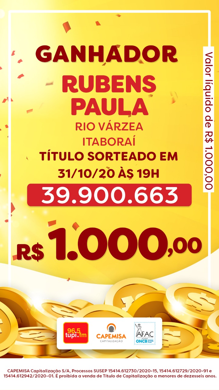 O segundo sorteio deste sábado, dia 31 de outubro, aconteceu às 19h20, logo depois do jogo (Botafogo x Ceará). O ganhador foi Rubens Paula (telefone: 96 98128-4xxx) , morador de Rio das Várzea, em Itaboraí, na Região Metropolitana do Rio. Ele faturou R$ 1 mil. O número do título sorteado foi: 39.900.663.