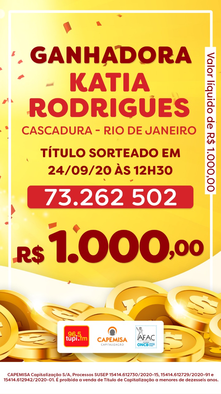 O primeiro sorteio desta quinta-feira, dia 24 de setembro, aconteceu às 12h30, dentro do programa Patrulha da Cidade. A ganhadora foi Katia Rodrigues (telefone: 21 96946-7xxx), moradora do bairro de Cascadura, na Zona Norte do Rio. Ela faturou R$ 1 mil. O número do título sorteado foi: 73.262.502.