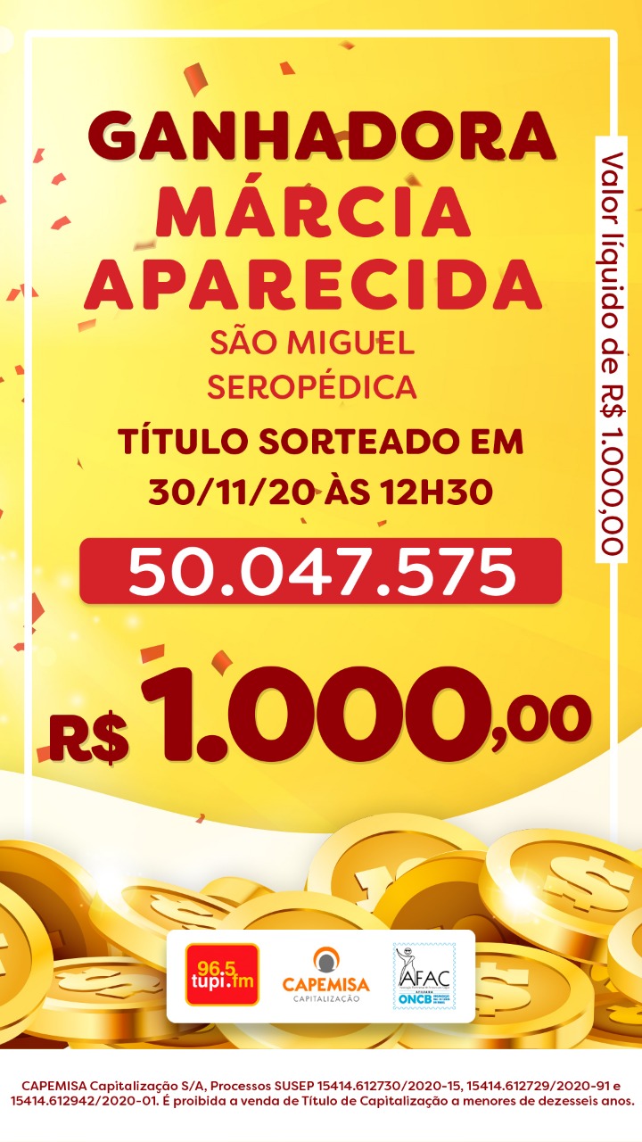 O primeiro sorteio desta segunda-feira, dia 30 de novembro, aconteceu às 12h30, dentro do programa Patrulha da Cidade. A ganhadora foi Márcia Aparecida (telefone: 21 96786-1xxx), moradora de São Miguel, em Seropédica, na Região Metropolitana do Rio. Ela faturou R$ 1 mil. O número do título sorteado foi: 50.047.575.