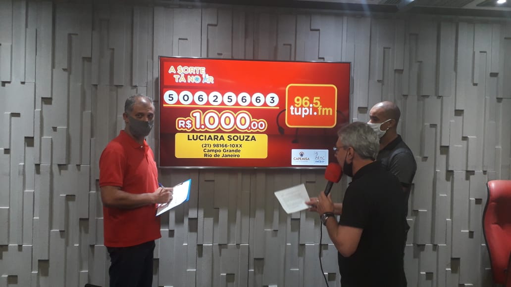 O primeiro sorteio desta quarta-feira aconteceu às 12h30, no programa Patrulha da Cidade. Você confere em 96,5 FM, no site Tupi.FM, no aplicativo e no canal do YouTube da Super Rádio Tupi.