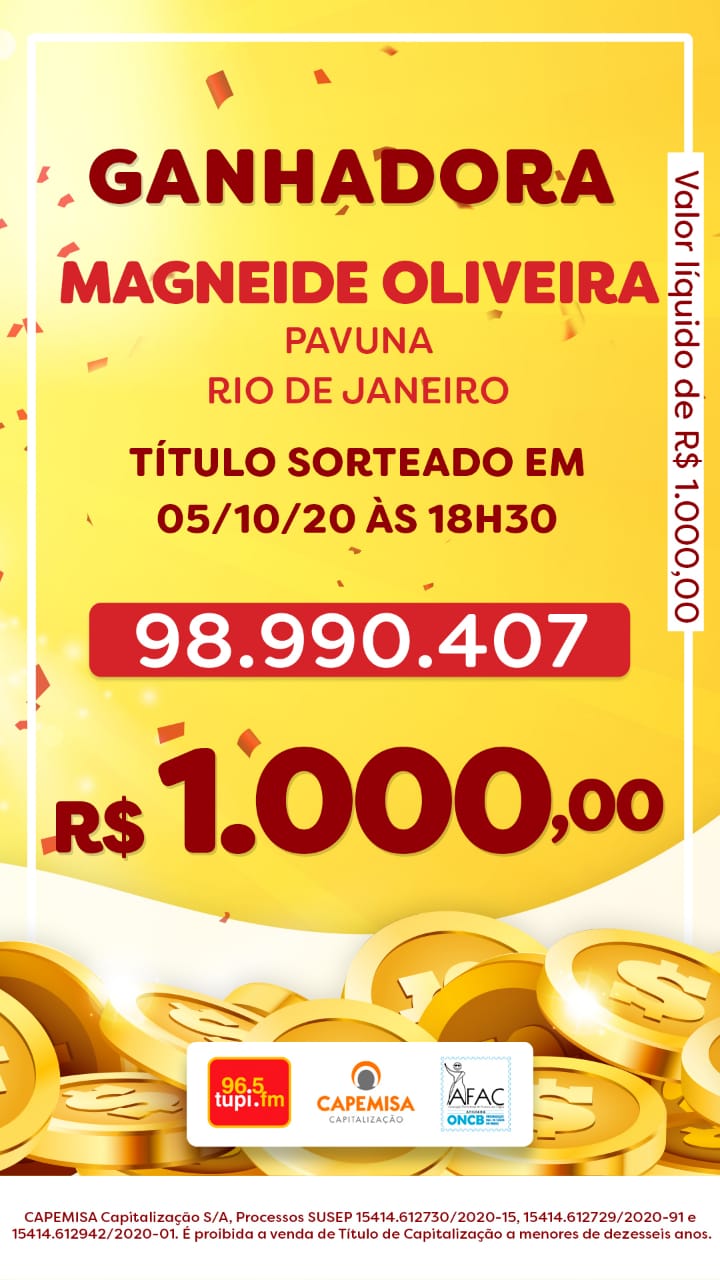 O segundo sorteio desta segunda-feira, dia 05 de outubro, aconteceu às 18h30, dentro do programa Show do Apolinho. A ganhadora foi Magneide Oliveira (telefone: 21 97041-84x), moradora da Pavuna, na Zona Norte do Rio de Janeiro. Ela faturou R$ 1 mil. O número do título sorteado foi: 98.990.407.
