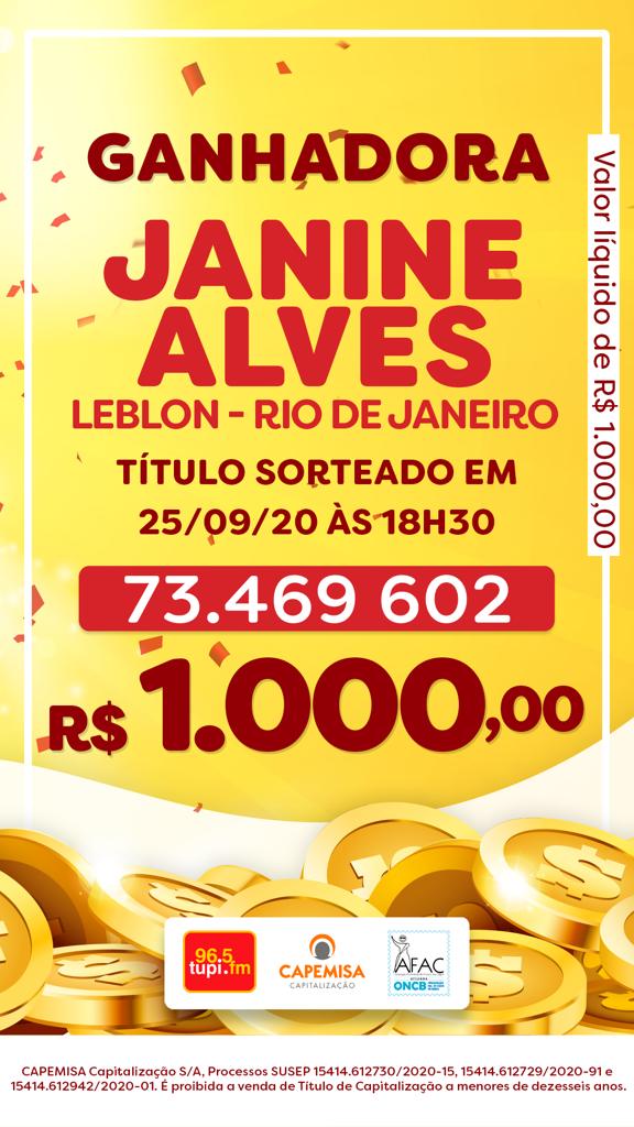 O segundo sorteio desta sexta-feira, dia 25 de setembro, aconteceu às 18h30, dentro do programa Show do Apolinho. A ganhadora foi Janine Alves (telefone: 21 99718-81xx), moradora do bairro Leblon, na Zona Sul do Rio. Ela faturou R$ 1 mil. O número do título sorteado foi: 73.469.602.