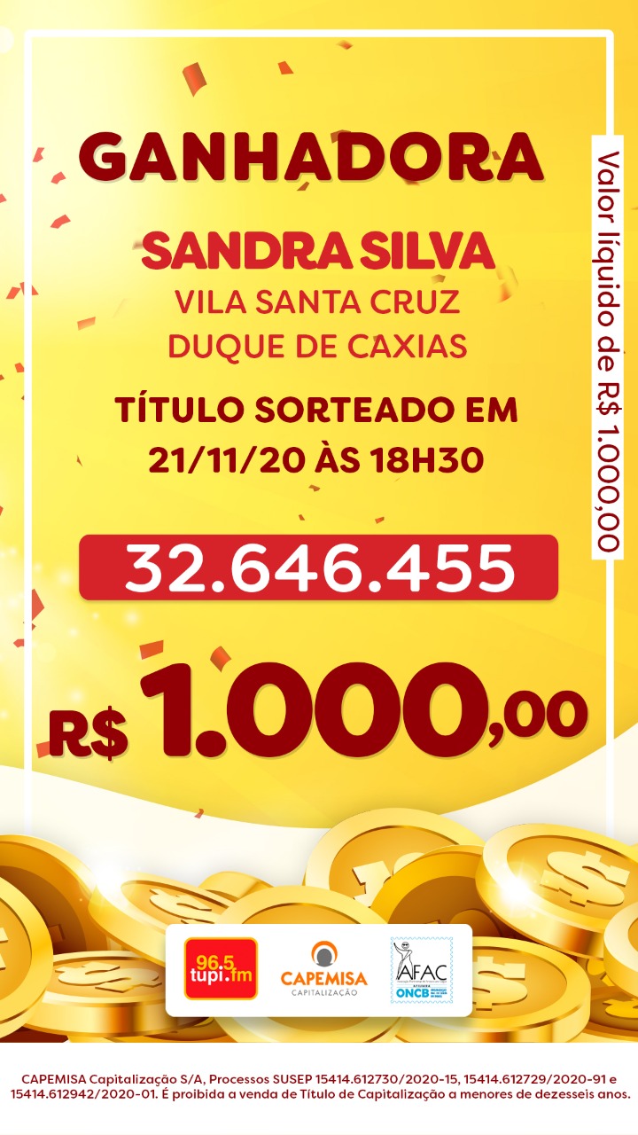 O segundo sorteio deste sábado, dia 21 de novembro, aconteceu às 18h30, no Super Futebol Tupi . A ganhadora foi Sandra Silva (telefone: 21 98004-9xxx), moradora do bairro do Vila Santa Cruz, em Duque de Caxias, na Baixada Fluminense. Ela faturou R$ 1 mil. O número do título sorteado foi: 32.646.455.