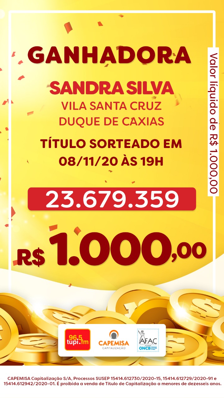 Neste domingo, dia 08 de novembro, duas pessoas pessoas foram sorteadas. A primeira vencedora foi Sandra Silva (telefone: 21 98004-9xxx), moradora do bairro de Vila Santa Cruz, em Duque de Caxias, na Baixada Fluminense. Ela faturou R$ 1 mil. O número do título sorteado foi: 23.679.359.