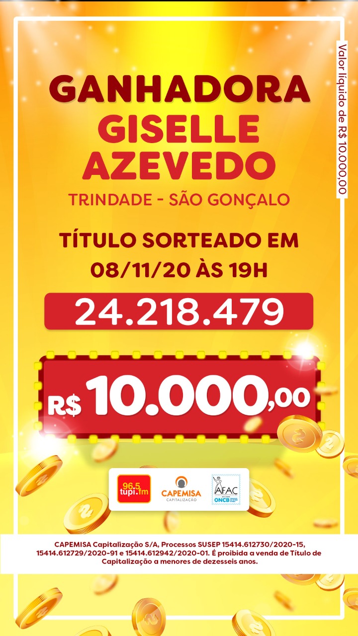 Já a segunda vencedora do segundo sorteio foi Giselle Azevedo (telefone: 21 98272-8xxx), moradora do bairro Trindade, em São Gonçalo, na Região Metropolitana do Rio. Ela faturou R$ 10 mil. O número do título sorteado foi: 24.218.479.