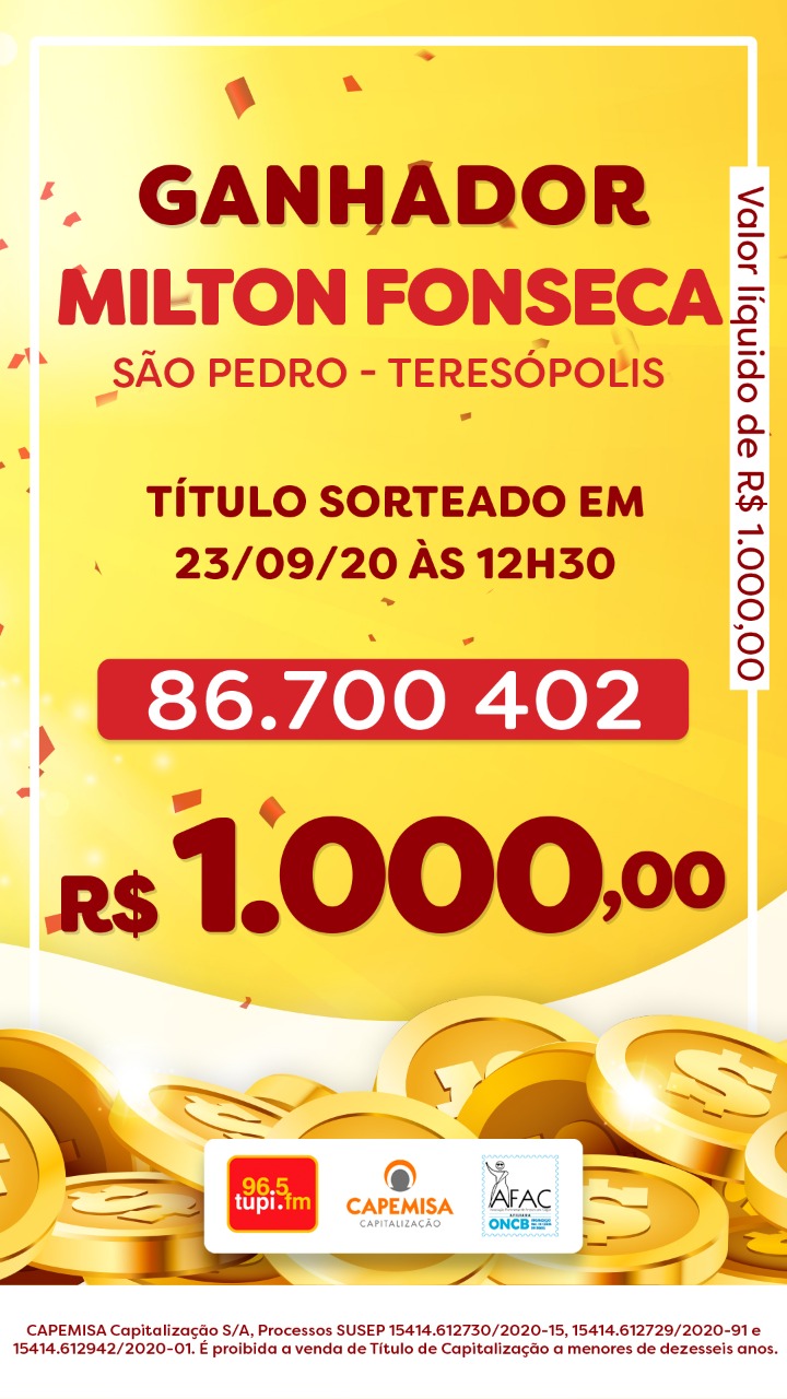 O primeiro sorteio desta quarta-feira, dia 23 de setembro, aconteceu às 12h30, dentro do programa Patrulha da Cidade. O ganhador foi Milton Fonseca (telefone: 21 99345-8xxx), morador do bairro de São Pedro, em Teresópolis, na Região Serrana do Rio. Ele faturou R$ 1 mil. O número do título sorteado foi: 86.700.402.