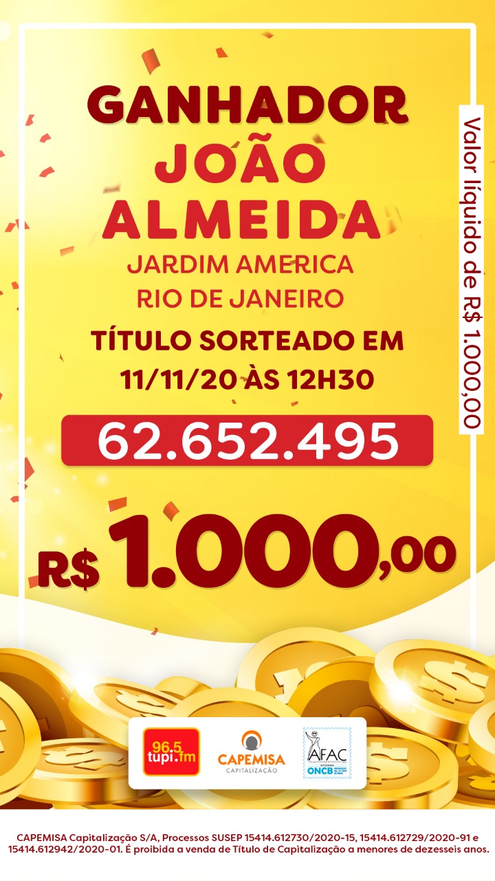 O primeiro sorteio desta quarta-feira, dia 11 de novembro, aconteceu às 12h30, dentro do programa Patrulha da Cidade. O ganhador foi João Almeida (telefone: 21 97200-6xxx), morador do bairro Jardim América, na Zona Norte do Rio. Ele faturou R$ 1 mil. O número do título sorteado foi: 62.652.495.