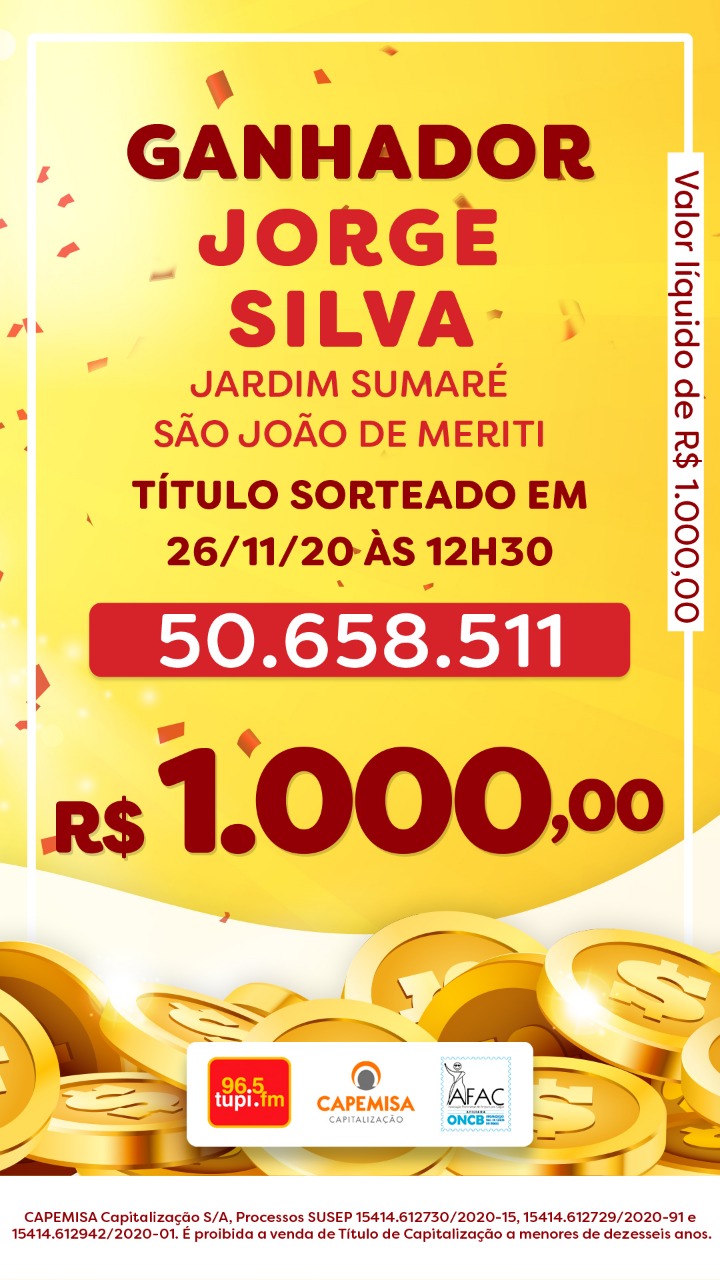 O primeiro sorteio desta quinta-feira, dia 26 de novembro, aconteceu às 12h30, dentro do programa Patrulha da Cidade. O ganhador foi Jorge Silva (telefone: 21 97250-1xxx), morador do bairro Jardim Sumaré, em São João de Meriti, na Baixada Fluminense. Ele faturou R$ 1 mil. O número do título sorteado foi: 50.658.511.