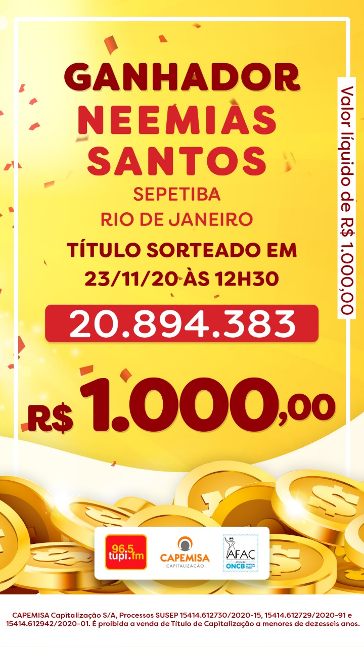 O primeiro sorteio desta segunda-feira, dia 23 de novembro, aconteceu às 12h30, dentro do programa Patrulha da Cidade. O ganhador foi Neemias Santos (telefone: 21 99596-4xxx), morador de Sepetiba, na Zona Oeste do Rio. Ele faturou R$ 1 mil. O número do título sorteado foi: 20.894.383.