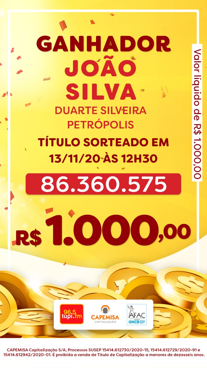 O primeiro sorteio desta sexta-feira, dia 13 de novembro, aconteceu às 12h30, dentro do programa Patrulha da Cidade. O ganhador foi João Silva (telefone: 21 99262-6xxx), morador do bairro de Duarte Silveira, em Petrópolis, na Região Serrana do Rio. Ele faturou R$ 1 mil. O número do título sorteado foi: 86.360.575.