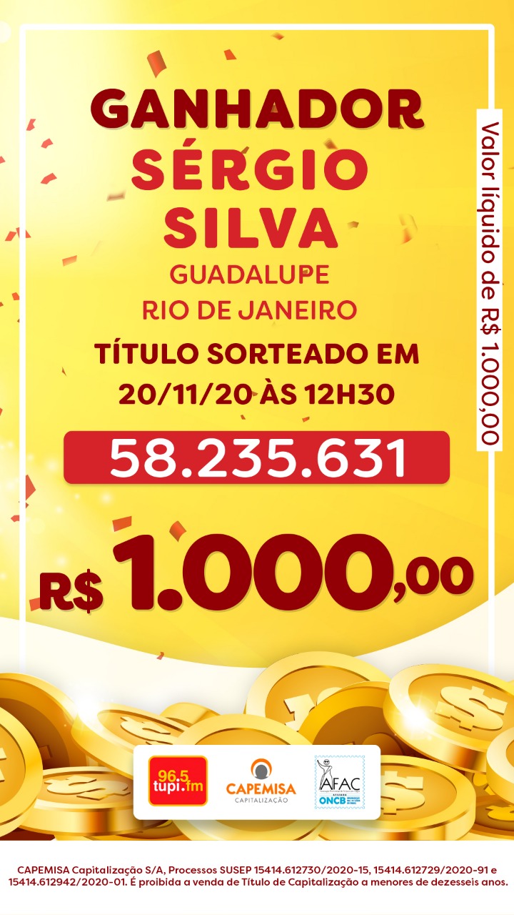 O primeiro sorteio desta sexta-feira, dia 20 de novembro, aconteceu às 12h30, dentro do programa Patrulha da Cidade. O ganhador foi Sérgio Silva (telefone: 21 99416-2xxx), morador do bairro de Guadalupe, na Zona Norte do Rio. Ele faturou R$ 1 mil. O número do título sorteado foi: 58.235.631.