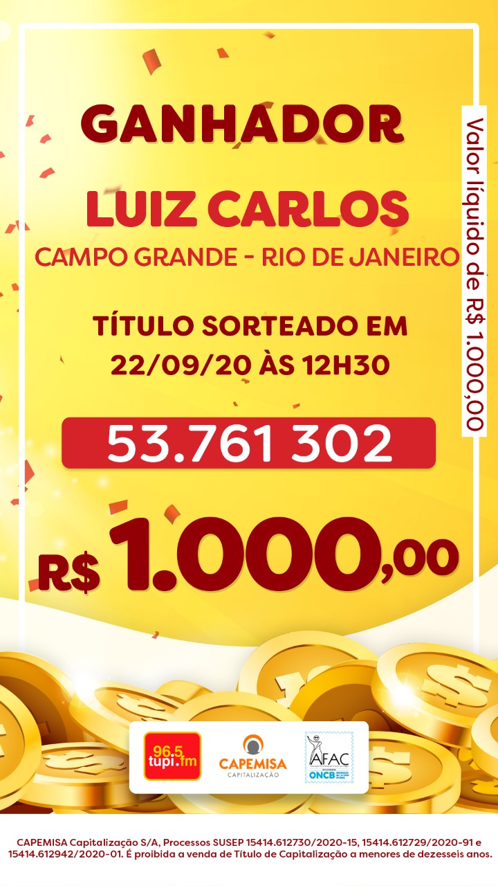 O primeiro sorteio desta terça-feira, dia 22 de setembro, aconteceu às 12h30, dentro do programa Patrulha da Cidade. O ganhador foi Luis Carlos (telefone: 21 99327-2xxx), morador de Campo Grande, na Zona Oeste do Rio. Ele faturou R$ 1 mil. O número do título sorteado foi: 53.761.302.