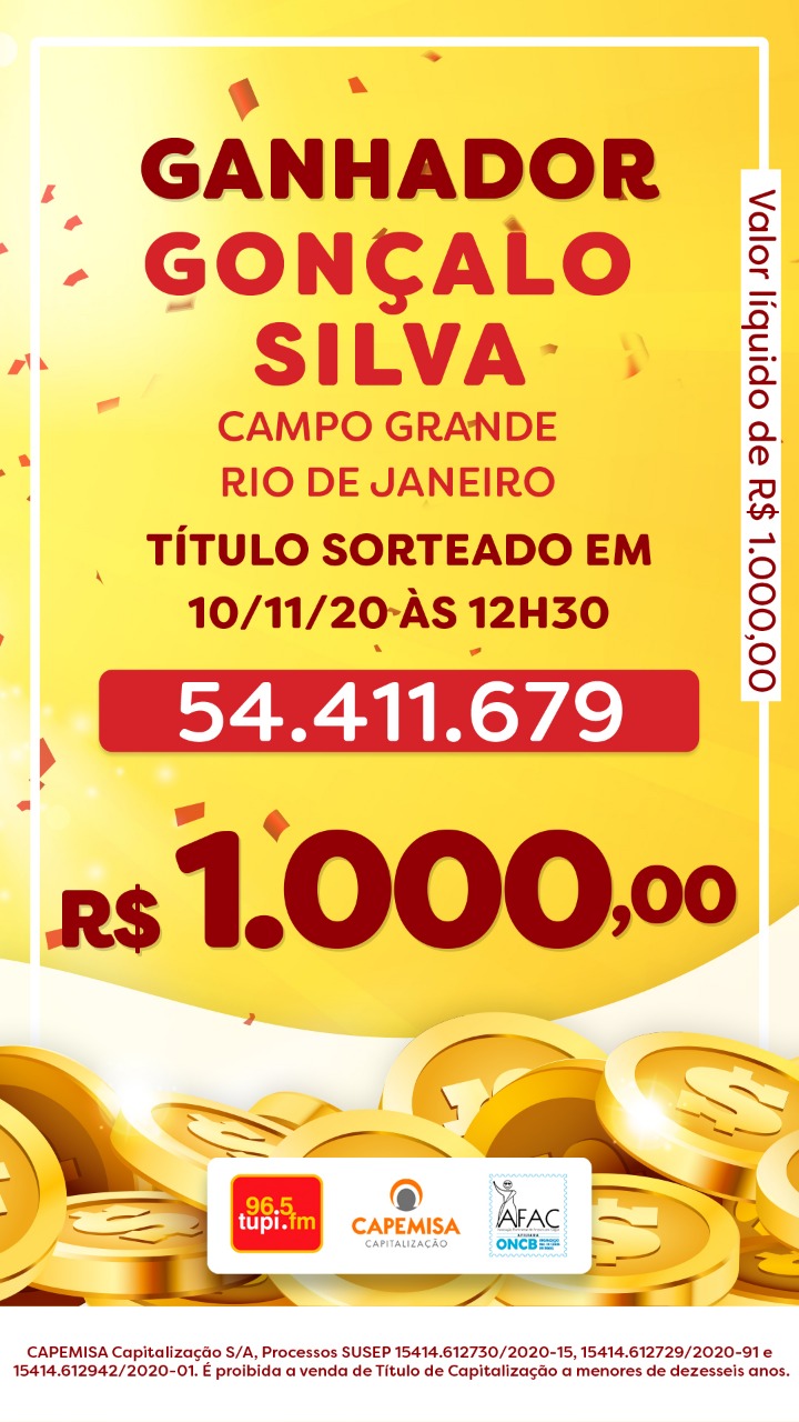O primeiro sorteio desta terça-feira, dia 10 de novembro, aconteceu às 12h30, dentro do programa Patrulha da Cidade. O ganhador foi Gonçalo Silva (telefone: 21 97394-6xxx), morador de Campo Grande, na Zona Oeste do Rio. Ele faturou R$ 1 mil. O número do título sorteado foi: 54.411.679.