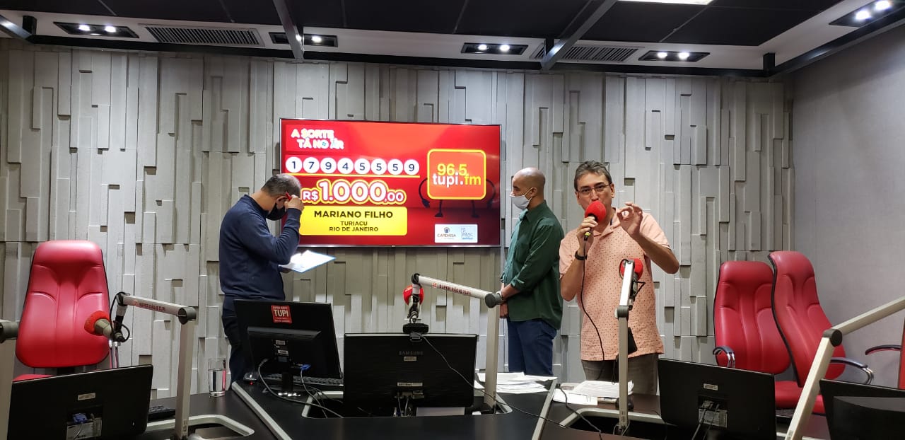 O segundo sorteio deste sábado acontece às 18h30, no programa Super Futebol Tupi. Você confere em 96,5 FM, no site Tupi.FM, no aplicativo e no canal do YouTube da Super Rádio Tupi.