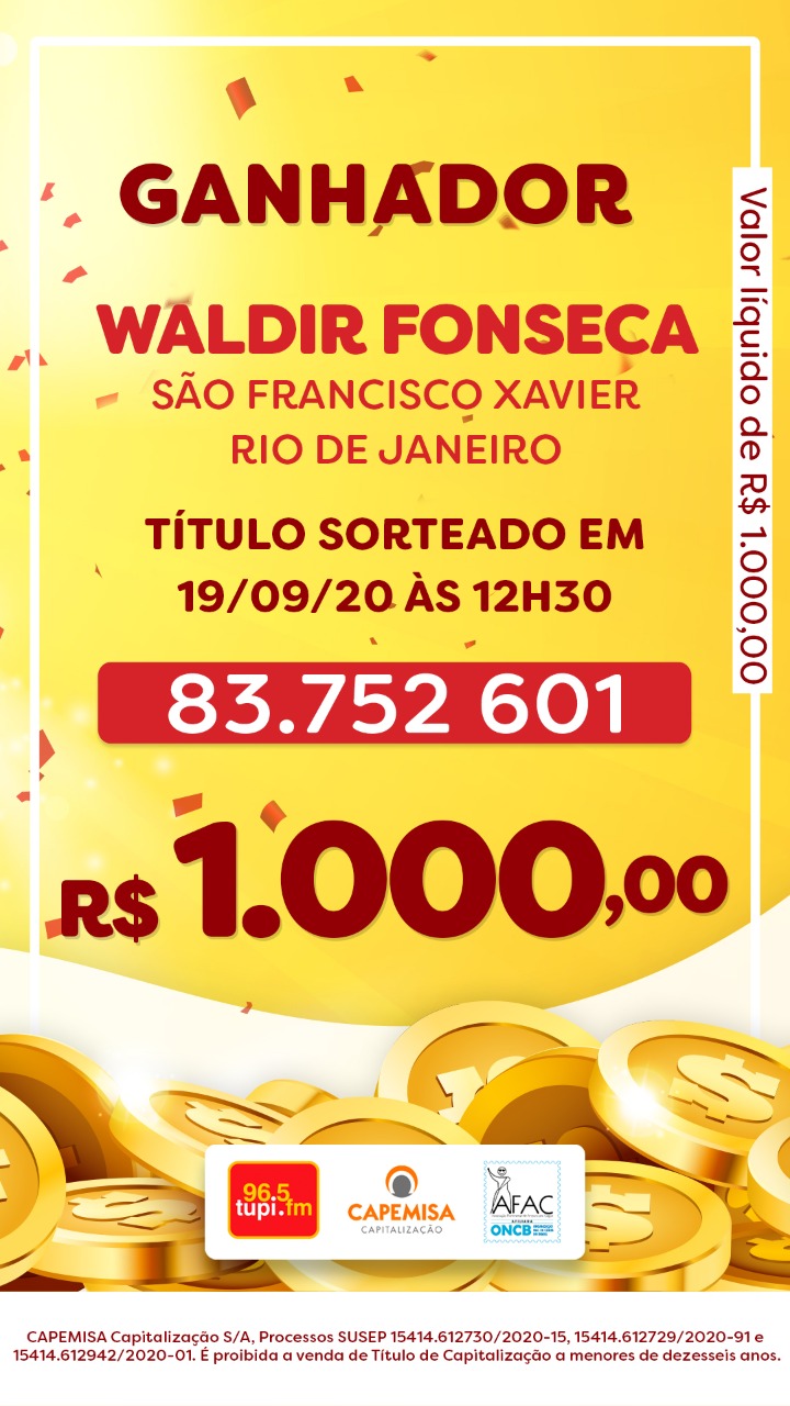 O primeiro sorteio deste sábado, dia 19 de setembro, aconteceu às 12h30, dentro do programa Patrulha da Cidade. O ganhador foi Waldir Fonseca, morador do bairro São Francisco Xavier, na Zona Norte do Rio. Ele faturou R$ 1 mil. O número do título sorteado foi: 83.752.601 .