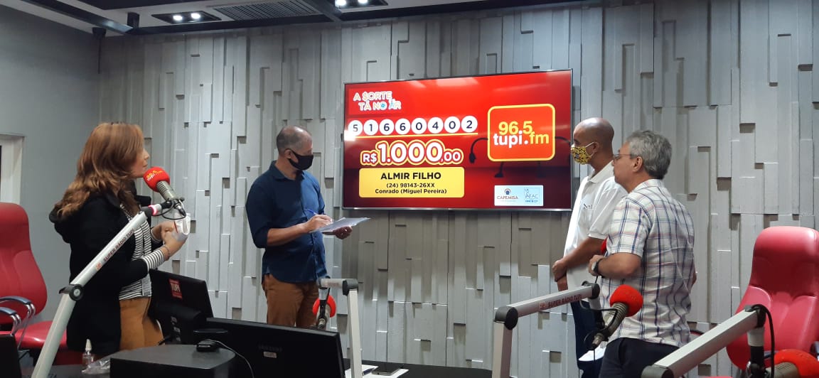 O primeiro sorteio desta quarta-feira aconteceu às 12h30, no programa Patrulha da Cidade. Você confere em 96,5 FM, no site Tupi.FM, no aplicativo e no canal do YouTube da Super Rádio Tupi.