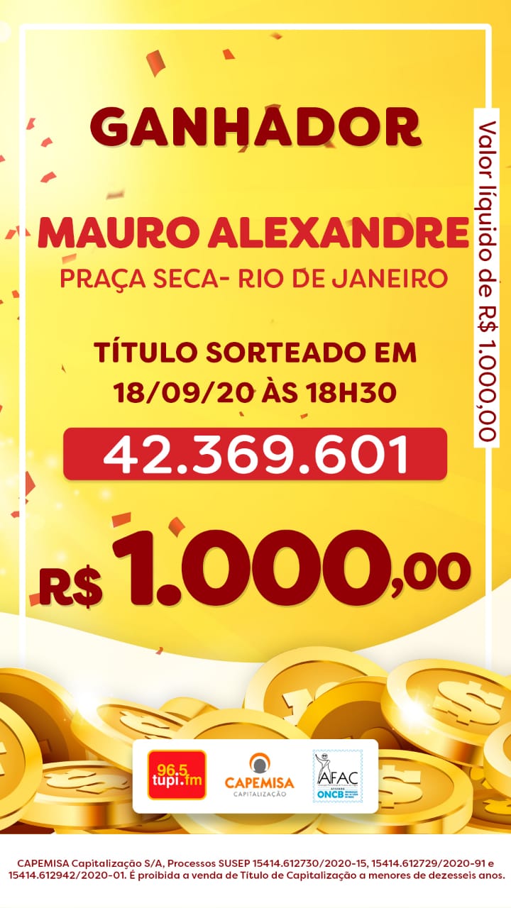 O primeiro sorteio desta sexta-feira, dia 18 de setembro, aconteceu às 12h30, dentro do programa Patrulha da Cidade. Você confere em 96,5 FM, no site Tupi.FM, no aplicativo e no canal do YouTube da Super Rádio Tupi.