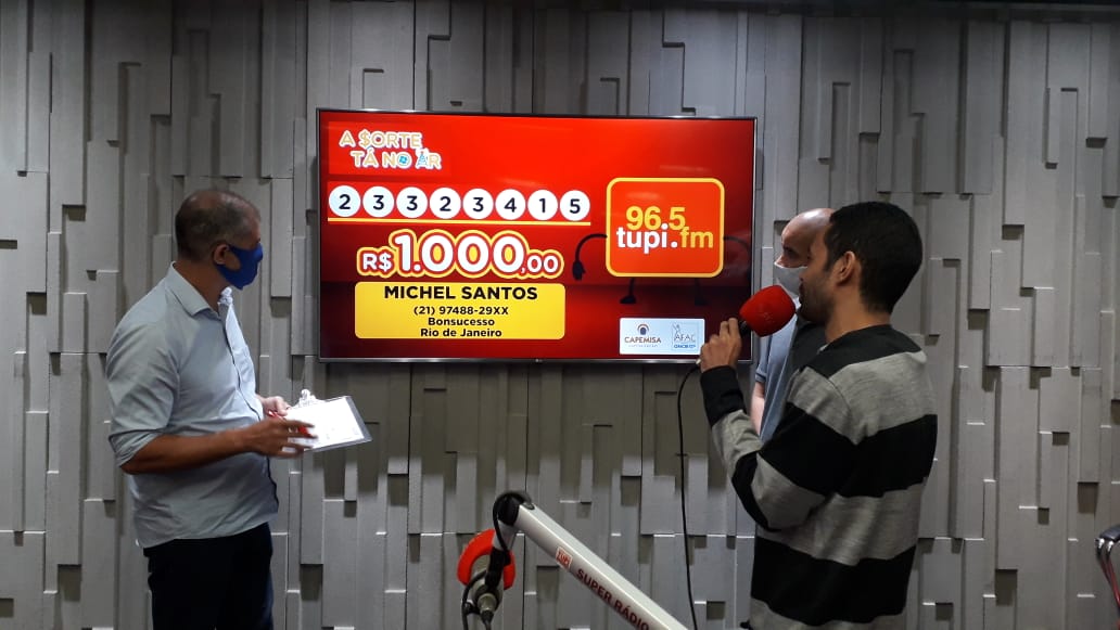 O primeiro sorteio desta segunda-feira aconteceu às 12h30, no programa Patrulha da Cidade. Você confere em 96,5 FM, no site Tupi.FM, no aplicativo e no canal do YouTube da Super Rádio Tupi.